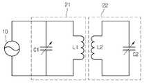 도 3은 본 발명의 일 실시 예에 따른 전력 소스(10)와 전력 송신부(20)의 등가 회로이다. 도 3에 도시된 바와 같이, 송신 코일부(21)와 송신 공진 코일부(22)는 각각 소정 인덕턴스 값과 캐패시턴스 값을 갖는 인덕터(L1, L2)와 캐패시터(C1, C2)로 구성될 수 있다.3 is an equivalent circuit of the