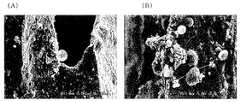 도 6 은 비교예 1 에서 조제한 재료 단면의 SEM 관찰 이미지이다. 도 6 의 (A) 는 상부의 관찰 이미지이고, 도 6 의 (B) 는 하부의 관찰 이미지이다. 상부를 나타내는 도 6 의 (A) 및 하부를 나타내는 도 6 의 (B) 에 있어서, 다수의 세포를 확인할 수 있지만, 이 세포의 대부분은 조직 재생에 불필요한 적혈구이다.6 is an SEM observation image of a material cross section prepared in Comparative Example 1. FIG. 6A is an observation image of the upper portion, and FIG. 6B is an observation image of the lower portion. In FIG. 6 (A) showing the upper part and FIG. 6 (B) showing the lower part, many cells can be identified, but most of these cells are red blood cells which are unnecessary for tissue regeneration.