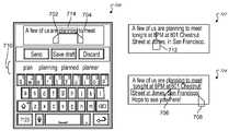 일부 실시예들에서, 사용자는 소정 시간 동안 터치스크린 디스플레이에 하나의 손가락을 터치할 수 있는데, 이는 사용자 손가락의 커서 위치를 지정하는 핀(712)을 위치시키기 위한 것이다(디스플레이 722에 도시된 바와 같이). 사용자의 손가락이 떨어지면, 컴퓨팅 디바이스는 (ⅰ) 단어 선택, (ⅱ) 모두 선택, (ⅲ) 붙여넣기(paste), (ⅳ) 잘라내기, 및 (ⅴ) 삭제 등의 다수개의 옵션들의 임의의 조합을 포함하는 메뉴(미도시)를 디스플레이할 수 있다. 이러한 일례에서, 사용자가 선택한 메뉴 옵션은 "단어 선택" 이다. 이에 응답하여, 컴퓨팅 디바이스는 단어 "8PM" 을 선택한다. 선택된 단어는 핀들에 의해서 경계가 설정되며(bounded), 사용자는 선택된 텍스트의 위치를 이동시키거나 사이즈를 조절하기 위하여 이러한 핀들을 드래그 할 수 있다. 상기 일례에서, 사용자는 단어 "8PM" 을 경계짓는 원래 위치들로부터 디스플레이(724)에 도시된 위치들로 핀(706)과 핀(708)을 드래그한다.