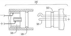 나사형 연결부(205)의 포함은 RTD 테스트의 자동화된 고속도 장치의 취급 및 실행을 수월하게 하지 않는다. 도 12에 있어서, 대안적인 커플링(205')은 핀(501) 및 해제 가능한 디텐트(503) 및/또는 해제 가능한 디텐트를 구비한 전기 베어링 표면(505), 회전 가능한 로킹(locking) 장치 등을 구비하는 연결부를 포함할 수 있다. 도시된 실시예에서, 디텐트(503)는 융기된 환형부(509)와 협력한다. 다르게는, 하나 이상의 편의된(biased) 볼이 융기된 환형부(509) 대신에 또는 이에 추가하여 사용될 수 있다. 이런 배치는 자동화된 장치의 취급을 수월하게 하고, RTD 의 빠르면서 정확한 테스트를 위한 대 용적을 제공하며, RTD 테스트 작업의 자동화된 장치의 실행을 수월하게 한다. 오리피스를 천공하는 동안에 품질 제어는 피드백 루프를 포함하여, RTD 테스트 결과를 모니터하여 사양으로부터 벗어나는 경향을 검출하여서, 마모된 드릴 바이트의 교체와 같은 시정조치를 취할 수 있게 한다.The inclusion of threaded
