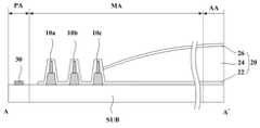도 9 및 도 10을 참조하면, 패드(30)가 형성된 패드 영역(PA)과 유기 발광 소자가 형성된 표시 영역(AA) 사이의 중간 영역(MA)에는 여러겹으로 형성된 다수의 댐(10a, 10b, 10c, 10d)이 형성된다.9 and 10, a plurality of