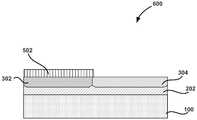 다음으로, 도 5에 도시된 바처럼, 구조물 (500) 은, 버퍼 층 (202) 위에 놓인 에피택셜 실리콘과 같은 에피택셜 재료를 선택적으로 성막하여 층 (502) 을 형성하는 것에 의해 형성된다.     층 (502) 은, 약 700℃ 내지 1000℃ 의 반응 온도 및 약 10 Torr의 반응기 압력에서 반응물로서 디클로로실란, 염화수소 (HCl), 및 수소를 이용하여 층 (202) 위에 (예를 들어, 영역 (302) 위에) 선택적으로 성막될 수도 있다.     층 (502) 을 성장시키기 위한 다른 예시적인 프로세스는 약 400 ∼ 600℃ 에서 트리실란 (Si3H8) 기반 순환 성막-에치 프로세스 (cyclic deposit-etch process) 를 사용하는 것을 포함한다.     각각의 프로세스는, 예를 들어, 명칭 IntrepidTM XP 또는 Epsilon® 하에 ASM 으로부터 입수가능한 반응기를 사용하여 수행될 수 있다.     게르마늄 전구체는 또한, 층 (502) 이 게르마늄을 포함할 때 이 단계 동안 사용될 수도 있다.     층 (502) 의 두께는 약 10 nm 에서 약 50 nm 까지 달라질 수 있다.     예를 들면, 층 (502) 의 두께는 약 30 nm일 수 있다.5, the