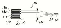 따라서, 상기 렌즈(36,40)들의 초점 길이는, 각각의 소스 빔(22) 내에서 적절한 확장을 제공하도록 선택됨으로써, 그것들은 결정(14)을 중첩하고, 느린 축 내의 어떤 영역도 펌핑되지 않은 상태로 남아 있지 않도록 한다. 전형적으로, 상기 이미터(20)의 폭은 ~150㎛ 이고, 그리고 결정 길이는 ~ 7mm이며, 전형적으로 f1x = 1.8mm 및 f2 = 80mm로서 얻어지는 ~ 47의 확대를 필요로 한다. 중요한 것은, 상기 이미터들의 확대된 이미지들은, 제3 렌즈(36)에 대한 초점 길이에 형성되어 공간적인 중첩을 보장한다. 따라서, 상기 결정 주변의 빔의 누출이 최소화되고, 상기 이미터 출력에서의 어떠한 공간적 변화도 확대된 이미지에 걸쳐서 평균화되어 상기 결정(14)의 균일한 펌핑을 얻게 된다.Thus, the focal lengths of the