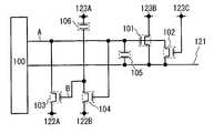 트랜지스터는 베이스, 이미터, 컬렉터인 적어도 3개의 단자를 갖는 소자이어도 된다는 점에 주목한다. 이 경우에도, 마찬가지로, 이미터와 컬렉터 중 하나를 제1 단자, 이미터와 컬렉터 중 나머지 하나를 제2 단자로 표기해도 된다.It should be noted that the transistor may be an element having at least three terminals: a base, an emitter, and a collector. In this case as well, one of the emitter and the collector may be referred to as a first terminal, and the other one of the emitter and the collector may be referred to as a second terminal.