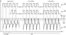 도 5a 및 도 5b는 터치 센서 구동 신호, 펜을 식별하는 코드를 포함하는 펜 구동 신호, 및 펜 구동 신호에 의해 영향을 받은 응답 신호의 전압 대 시간 그래프들을 도시한다;