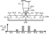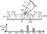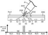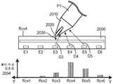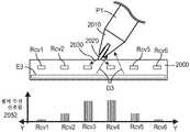 Fig. 20B shows a cross-sectional view (YY) of the electrode matrix of Fig. 19A with the pen P1, which releases the pen drive signal via the farther (distal) Receives the sensor drive signal through the near (proximal) portion;