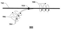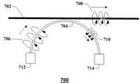 전기 신호들과 달리, 유도 전자기파들은 전송 디바이스 및 수신 디바이스 사이에서의 별개의 전기적 리턴 경로를 요구하지 않고 전송 디바이스로부터 수신 디바이스로 전파될 수 있다. 결과로서, 유도 전자기파들은 전도성 구성요소들(예로서, 유전체 스트립) 없이 송신 매체를 따라, 또는 단지 단일 도체(예로서, 단일 나선 또는 절연 와이어)를 갖는 송신 매체를 통해 전송 디바이스로부터 수신 디바이스로 전파될 수 있다. 송신 매체가 하나 이상의 전도성 구성요소들을 포함하며 송신 매체를 따라 전파되는 유도 전자기파들이 유도 전자기파들의 방향으로 하나 이상의 전도성 구성요소들에서 흐르는 전류를 발생시킬지라도, 이러한 유도 전자기파들은 전송 디바이스 및 수신 디바이스 사이에서의 전기적 리턴 경로 상에서 반대 전류들의 흐름을 요구하지 않고 전송 디바이스로부터 수신 디바이스로 송신 매체를 따라 전파될 수 있다.Unlike electrical signals, inductive electromagnetic waves can propagate from a transmitting device to a receiving device without requiring a separate electrical return path between the transmitting device and the receiving device. As a result, the inductive electromagnetic waves propagate along the transmission medium without conducting components (e.g., dielectric strips), or from the transmitting device to the receiving device via a transmission medium having only a single conductor (e.g., a single helix or insulating wire) . Although the transmission medium includes one or more conductive elements and the inductive electromagnetic waves propagating along the transmission medium generate a current flowing in the one or more conductive elements in the direction of the inductive electromagnetic waves, May be propagated along the transmission medium from the transmitting device to the receiving device without requiring a flow of counter currents on the electrical return path of the receiving device.