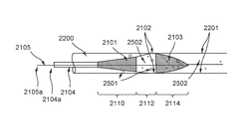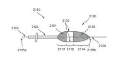 도 21은 제 6예시적인 측면을 도시하며, 필터 조립체(2150)는 테더형 필터(2100), 튜브(2104), 및 와이어(2105)를 포함한다. 테더형 필터(2100)는 제 1메쉬(2101), 제 2메쉬(2103), 및 지지부재(2102)를 포함한다. 제 1메쉬(2101 )는 필터(2100)의 제 1전방영역(2110)에 위치될 수 있고; 제 2메쉬(2103)는 필터(2100)의 후방영역(2114)에 위치될 수 있고; 지지부재(2102)는 필터(2100)의 제 2전방영역(2112)에 위치될 수 있다. 제 2전방영역(2112)은 제 1전방영역(2110)에 대해 후방일 수 있고, 후방영역(2114)은 제 1전방영역(2110) 및 제 2전방영역(2112) 모두에 대해 후방일 수 있다.FIG. 21 illustrates a sixth exemplary aspect, wherein