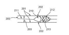 필터 조립체(100)와 같은 기존의 필터 조립체는 혈류에 포함되어 있는 특정 입자를 모을 수 있지만, 몇 가지 단점을 지닌다. 도 2에서, 필터(210) 및 필터 와이어(211)를 갖는 필터 조립체는 환자의 혈관에 배치된다. 혈관은 혈관 내강(vessel lumen) (200) 및 혈관 벽(201)을 갖는다. 필터(210)는 혈관 내에 끼워져서 이 필터(210)의 메쉬(212)가 혈관 벽(201)의 내부면과 실질적으로 접촉하도록 하는 크기를 가질 수 있다. 그와 같이, 팽창된 상태 (가령, 자유로운 상태)에서, 필터(210)는 메쉬(212)가 혈관 벽(201)과 접촉할 때까지 증가하는 장경(213)을 가질 수 있다.Conventional filter assemblies, such as