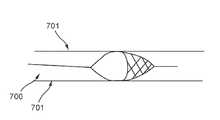도 7에 도시된 혈관은 혈관 벽(701)과 혈관 내강(700)을 갖는다. 필터(600)가 혈관 내강(700) 내로 전개되면, 필터(600)는 접선을 가질 수 있고 혈관 벽(701)의 내부면과 실질적으로 접촉할 수 있다. 혈관 벽(701)의 내부면과 필터(600) 간의 접촉이 지지부재(605)를 따르는 지점 및 메쉬(604)로부터 더 상류에서 시작하므로, 메쉬(604)의 전방단과 혈관 벽(701) 사이에는 공간이 존재하지 않는다. 따라서, 폐색 물질은 필터(600)와 혈관 벽(701) 사이에 축적될 수 없으며, 이는 테더형 필터(600) 가 혈관에서 제거되는 동안 그러한 물질이 혈류로 다시 빠져 나갈 위험을 감소시킨다.The blood vessel shown in Fig. 7 has a