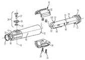 추진 카트리지(60)의 제 2 하우징(70)의 하부 단부(73)는 제 1 및 제 2 하우징들(68, 70)이 축방향으로 정렬되며 제 3 축(C)을 추가로 정의하도록 추진 카트리지(60)의 제 1 하우징(68)의 부분(158)을 수용하도록 구성된다. 도 1의 예시된 실시예에서, 제 3 축(C)은 제 1 축(A)과 동축이다. 다른 실시예들에서, 제 3 축(C)은 제 1 축(A)에 평행하지만, 그것과 동축이 아닐 수 있다. 함께 결합될 때, 하우징들(68, 70)은 추진 봉(62)이 그것을 통해 연장되도록 구성된 통로(160)를 가진 실질적으로 원통형 내부를 정의한다. 상부 단부(71)에서, 제 2 하우징(70)은 플랜지(72) 및 플랜지(72)보다 작은 직경의 확장부(74)를 포함한다. 플랜지(72)는 추진 카트리지(60) 및 하우징(16) 사이에서의 단단한 맞춤을 위해 하우징(16)의 상부 단부(12)에서 리세스(162)에 맞도록 성형된다. 확장부(74)는, 이하에서 추가로 상세하게 설명되는 바와 같이, 추진 봉(62)에 동작 가능하게 맞물리는 복수의 슬롯들(164)을 포함한다. 제 2 하우징(70)은 또한, 도 9에 예시된 바와 같이, 추진 스프링(66)의 제 1 단부(168)를 위한 제 1 시트를 제공하기 위해 내부 립(75)을 포함할 수 있다.The