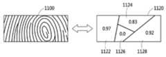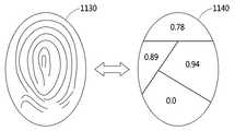일 실시예에 따르면, 지문 인증 장치는 매칭 영역별 유사도를 이용하여 임계 값보다 큰 유사도를 가지는 매칭 영역의 크기가 임계 영역 크기보다 큰지 여부에 기초하여 인증 성공 여부를 판단할 수 있다. 예를 들어, 임계 값이 0.90이고, 임계 영역 크기가 A(e.g., 4000)라고 가정하는 경우, 지문 인증 장치는 제1 매칭 영역(1122)과 제4 매칭 영역(1128)의 면적 합이 A보다 크면 인증 성공이라고 결정할 수 있다. 매칭 영역별 유사도(1120)가 영상으로서 구현되는 경우, 위 면적 합은 해당 영상에서 0.90보다 큰 유사도를 가지는 픽셀의 개수로 결정될 수 있다.According to one embodiment, the fingerprint authentication apparatus can determine whether authentication is successful based on whether the size of the matching area having a degree of similarity larger than the threshold value is larger than the critical area size, using the similarity for each matching area. For example, assuming that the threshold value is 0.90 and the critical area size is A (eg, 4000), the fingerprint authentication apparatus checks whether the area sum of the