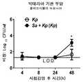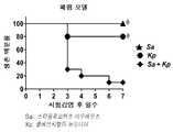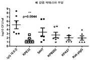 도 7a 내지 도 7d는 KPE33이 클레브시엘라 뉴모니아 및 스타필로코커스 아우레우스 동시-감염 모델에서 보호함을 보여준다.도 7a는 클레브시엘라 뉴모니아 및 스타필로코커스 아우레우스의 하위-치명적인 접종물로의 동시-감염이 치명적인 폐렴을 야기하였음을 보여준다. 클레브시엘라 뉴모니아 박테리아 부담은 단독의 클레브시엘라 뉴모니아로 감염된 마우스에 비하여 클레브시엘라 뉴모니아 및 스타필로코커스 아우레우스로 동시-감염된 마우스의 폐(도 7b) 및 비장(도 7c)에서 유의미하게 증가하였다.도 7d는 동시-감염 24시간 전의 KPE33(0.5 ㎖, 복강내)으로의 단일의 처치가 치명적인 동시-감염으로부터 마우스를 구제하였음을 보여준다.