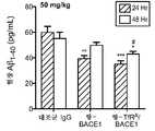 Figures 4a-e show that a single systemic dose of anti-TfRA /BACE1 significantly reduced central and peripheral Aβ1-40.4A-D show brain (A,B) and plasma (C,D) Aβ 1-40 levels after 25 mg/kg or 50 mg/kg IV-injection of control IgG, anti-BACE1, or anti-TfR/BACE1 Shows the quantification of. Briefly, for Abeta1-40 measurement, hemi-brain was homogenized in 5 M guanidine hydrochloride buffer, the sample was spun at room temperature for 3 hours, and then freshly added aprotinin (20 mg/ mL) and leupeptin (10 mg/ml) in 0.25% casein in PBS, 5 mM EDTA (pH 8.0) (1:10). The diluted homogenate was centrifuged at 14,000 rpm for 20 minutes, and the supernatant was isolated for Abeta1-40 measurement. For antibody concentration determination, the corresponding half-brains from each mouse were homogenized in 1% NP-40 as described above. Before perfusion, whole blood was collected in EDTA microtainer tubes (BD Diagnostics), centrifuged at 5,000 xg for 15 minutes, and plasma mouse Abeta1-40 and anti-TfR/BACE1 concentrations were determined. The supernatant was isolated for this purpose. The concentration of total mouse Abeta1-40 in plasma and brain was determined using a sandwich ELISA following a procedure similar to that described above. A rabbit polyclonal antibody specific for the C-terminus of Abeta1-40 (Millipore, Bedford, MA) was coated on the plate and biotinylated anti-mouse Abeta monoclonal antibody M3.2 ( Covance (Dedham, Massachusetts, USA) was used for detection. The lower limit of quantification of the assay was 1.96 pg/ml in plasma and 39.1 pg/g in brain. Statistical analysis of the differences between the experimental groups was performed using a two-tailed unpaired t-test.* Represents the significance compared to the control IgG, # represents the significance compared to the anti-BACE1.* p<0.05,** p<0.01,*** p<0.001; n=10 (for all groups).4E shows the mean Aβ 1-40 reduction from the data in (AD), calculated as a percentage ofAβ 1-40 levels compared to control IgG-injected mice.