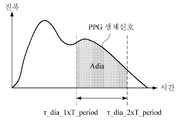 여기서, Adia는 이완기 혈압 추정을 위한 제2 구간의 면적을 의미한다. T_dia_1 및 T_dia_2는 제2 구간의 시작시점과 종료시점을 의미한다. P(t)는 시점(t)에서의 진폭을 의미하고, Pbase는 기저선(baseline)의 진폭을 의미한다. 이때, 기저선의 진폭은 생체신호의 최초 시작시점의 진폭값 또는 생체신호의 전체 구간에서의 진폭의 최소값일 수 있다. 또는 시작시점과 종료시점을 연결한 직선상의 진폭값 예컨대, 시점(t)에 대하여 그 직선상에서 시점(t)에 대응하는 진폭값일 수 있으나 이에 제한되는 것은 아니다. τ_dia_1 및 τ_dia_2는 각각 제2 구간의 시작 기준값 및 종료 기준값을 의미한다. T_period는 생체신호의 주기를 나타낸다.Here, Adia refers to the area of the second section for diastolic blood pressure estimation. T_dia_1 and T_dia_2 mean the start and end times of the second section. P (t) means the amplitude at the time point t, and Pbase means the amplitude of the baseline. At this time, the amplitude of the baseline may be an amplitude value at the initial start point of the biosignal or a minimum value of the amplitude in the entire section of the biosignal. Alternatively, the amplitude value on the straight line connecting the start point and the end point may be, for example, an amplitude value corresponding to the time point t on the straight line, but is not limited thereto. τ_dia_1 and τ_dia_2 mean the start reference value and the end reference value of the second section, respectively. T_period represents the period of the biosignal.