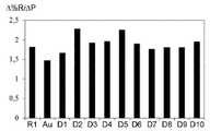 도 7은 초과 압력(ΔΡ)에 응하여 비부동태화 기판을 갖는 본 발명에 따른 검출 시스템의 D1 내지 D10으로 나타내어지는 10개의 검출 센서, 그리고 R1로 나타내어지는 참조 센서에 대한 SPRi에 의해 얻어지는 바에 따른 비율(Δ%R/ΔP)(반사율의 변화 대 압력의 변화)을 막대 그래프의 형태로 도시하며; 기판의 표면을 형성하는 Au로 나타내어지는 금층의 영역에 대해 얻어지는 비율(Δ%R/ΔP)이 또한 나타내어진다.