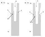 본 발명에 따른 시험체의 음의 부품(1, 위)(저면도)과 양의 부품(2, 바닥)이 도 7a에서 평면도로 도시된다. 음의 부품(1)의 저면도는 시험체의 배열을 조치로서 사용하기 때문에 아래에서 음의 부품을 고려한다. 따라서, 시험체의 2개의 부품에 대한 도 7a는 대응하고 시험체에서 서로 위에 놓이게 되며 그에 따라 접합된 시험체 내부에 위치하는 접촉 표면을 도시한다. 채널(6)은 음의 부품(1)의 2개의 둥근 포스트 각각에서 중앙에 보여진다. 모스 테이퍼(4)는 두 포스트에서 이 채널을 직접 둘러싸고 있다. 차례로 수평 접촉 표면(3)이 모스 테이퍼의 측면에 연결된다. 포스트(9b)에서, 모스 테이퍼의 측면은 수평 접촉 표면(3)에 의해 주변의 절반으로 둘러싸여 있다. 바깥 쪽을 향하는 포스트(9b)의 측면에서, 음의 부품의 모스 테이퍼의 측면은 포스트의 외부 측면으로 더 형성된다. 사면이 컬럼의 측면까지 그리고 시험체의 표면까지 도달하는 비스듬한 접촉 표면(5)이 포스트(9a)의 외측으로 배열된다. 이 접촉 표면(5)은 컬럼 주변의 경사각(점선으로 표시됨)을 변경한다.The negative part 1 (top) (bottom view) and the positive part 2 (bottom) of the test body according to the invention are shown in plan view in FIG. 7A. Since the bottom view of the negative part (1) uses the arrangement of the test object as a measure, consider the negative part below. Thus, Fig. 7A for the two parts of the test body shows the contact surfaces that correspond and lie on top of each other in the test body and thus are located inside the bonded test body. The