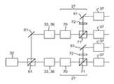 도 10에 도시된 바와 같이, 일 실시예에서 계측 장치(MT)는 방사선 소스(32)로부터 방사선을 수광하도록 구성된 빔 스플리터(61)를 포함한다.  빔 스플리터(61)는 2개의 상이한 브랜치를 따라 방사선을 지향시키도록 구성된다.  이러한 빔 스플리터(61)의 제공은 필수적인 것은 아니다.  대안적인 실시예에서, 방사선은 도 10에 도시된 2개의 브랜치 중 하나를 따라(즉, 단지 하나의 포켈스 셀(70)을 이용) 방사선 소스(32)로부터 지향된다.  나머지 브랜치(나머지 포켈스 셀(70)을 이용)는 선택 사항이다. As shown in FIG. 10, in one embodiment the metrology device MT includes a