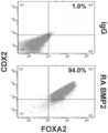 2A-2D show that a differentiation method using bone morphogenetic protein-4 (BMP4) results in a monolayer of intestinal mesenchymal endoderm cells that contain both CDX2 and FOXA2 at the transcript and protein levels. 2A (bottom) shows that 90.0±5.85% of S3D5 cells co-expressed for both CDX2 and FOXA2 proteins, similar to the percentage observed in Caco-2 cells (86.0±6.67). In contrast, there was no CDX2 and FOXA2 coexistence in definitive endoderm (DE - S1D3) cells (2.3±1.2). Gene expression analysis showed that CDX2 was induced during phase 3 (FIG. 2B) and FOXA2 was maintained (FIG. 2C). Fig. 2d shows that CDX2 protein levels and CDX2/FOXA2 protein coexistence were induced after the establishment of the FOXA2-positive primitive intestinal endoderm stage, S2D2 (Fig. 2d-i), and gradually increased until S3D2 (Fig. 2d-ii), followed by S3D5 (Fig. 2d-i). 2d-iii) reached levels similar to those seen in Caco-2 cells (Fig. 2d-iv). CDX2 protein is shown in the bottom row and FOXA2 protein is shown in the top row. Each image was taken using the same parameters to enable quantitative analysis. Protein expression was assessed by FACS; Gene expression was assessed by qPCR.