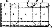 따라서, 하나 또는 복수의 완전 절단선에서 시작하여, 이에 상응하여 바깥쪽으로 뻗치는 과정에 있어서, 팩에 스폰구멍 및 음용빨대 및 유출 및 음용구멍이 형성될 수 있다. 이때, 점선이 완전 절단선의 후방으로 끝이 가늘어지고 구멍선단이 팩의 측면에 접하는 접는 삼각형의 범위에까지 연장하는 것이 편리하다. 이러한 타입의 팩은 쉽게 개방될 수 있고, 팩을 열때, 전혀 내용물이 엎질러지지 않는다. 왜냐하면, 팩은 열린때에 팩의 바닥에서 평평면 위에 완전히 세워지고 동시에 접혀진 크기를 유지하면서 세워져서, 즉, 내용물을 포함하는 공간이 변형되지 않기 때문이다. 소위 러그(lug)타입의 팩에서는, 모퉁이 접합부만을 일으켜 세우면 된다.Thus, in the process of starting at one or a plurality of complete cut lines and correspondingly extending outwards, spawning holes and drinking straws and outflowing and drinking holes may be formed in the pack. At this time, it is convenient for the dotted line to extend to the range of the folding triangle where the tip is tapered to the rear of the complete cutting line and the hole tip is in contact with the side of the pack. Packs of this type can be easily opened and do not spill any contents when opening the pack. This is because the pack is erected on a flat surface at the bottom of the pack when it is opened and at the same time maintaining its folded size, ie the space containing the contents is not deformed. In the so-called lug pack, only the corner joints can be raised.