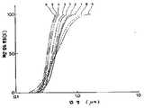 제1도에서, 실시예 1∼4, 특히 3은 평균 입경이 0.7㎛ 정도로 매우 좁은 입도 분포를 지닌 것을 알 수 있다.In FIG. 1, it can be seen that Examples 1 to 4, especially 3, have a very narrow particle size distribution with an average particle diameter of about 0.7 μm.