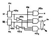 제어회로(42)는 레지스터 디코더(421) 및 모드 판별회로(422)로 구성된다. 레지스터 디코더(421)는 행 어드레스 신호와의 2개의 비트(RA0및 RA1)에 의존하는 레지스터 선택신호(a1, a2및 a3)의 레벨을 결정한다. 예를 들면, 비트(RA0)가 "L"에 있고 비트(RA1)가 "L"에 있을 때 레지스터 선택신호(a3)는 "H"에 세트되고 다른신호(a1및 a2)는 "I"에 세트된다.The