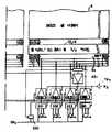 제 1 도에는 나타난 입력/출력 버퍼(35)는 센스버퍼(351)와 기입 증폭기(352)로 구성된다. 유사하게, 입력/출력 버퍼는(36, 37 및 38)는 센스버퍼(351, 371 및 381) 및 기입 증폭기로 각각 구성된다. 기입증폭기(352, 362, 372 및 382)의 인에이블/디스에이블 상태는 정상동작모드/블록동작모드 스위칭 신호(B)로 이루어지는 인에이블/디스에이블 제어신호(T)와 소정시간만큼 레지스터 동작모드 세팅신호(R)를 지연시키는 타이밍 조정회로(TA0)의 출력에 의해 제어된다. 기입 증폭기(352, 362, 372 및 382)는 타이밍 조정회로(TA4)를 통하여 4-비트 마스크 레지스터(41)의 최하위 비트 디지트(M0)에 설치된다. 디지트(M0)가 0일 때 기입증폭기(352, 362, 372 및 382)의 출력은 마스크된다. 기입증폭기(352, 362, 372 및 382)의 출력단자는 제 2a 도에서 처럼 메모리셀 어레이(1)에 의해 버스(DB1)에 연결된다. 센스버퍼(352, 361, 371 및 381)의 인에이블/디스에이블 상태는 레지스터 동작모드 세팅신호(R)를 소정시간만큼 지연시키는 타이밍 조정회로(TA2)의 추력신호에 의해 제어된다. 게다가, 센스버퍼(351)의 인에이블/디스에이블 상태는 정상동작모드/블록동작모드 세팅신호(B)를 지연시키는 타이밍 조정회로(TA1)의 출력에 의해 제어된다. 센스버퍼(361, 371 및 381)는 제 2a 도에 도시된 것처럼 데이터 버스(DB1)에 접속된다. 센스버퍼(351)는 선택기(S5)를 경유하여 데이터 버스(DB1)에 접속되고, 선택기(S5)는 1/4어드레스,디코더(D1)에 의해 제어된다(이것은 간소화를 위해 제 1 도 에서 제외됐다).The input /