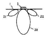 그리고, 탄성파검출부를 압전세라믹 등으로 이루어지는 고체진동 소자로 구성한 경우의 지향특성을 제14도에 나타낸다. 투명판(1)의 측면(코너부는 아님)에 탄성파검출부로서의 고체진동소자(2)를 부착한 경우, 지향성의 영향으로 이 소자로부터 등거리의 위치로부터 탄성파를 방사해도, 이 소자에서의 검출파형의 진폭은 반드시 동일하지 않고, 검도분포(20)에 의하면 진동소자(2)에 수직방향이 가장 감도가 높다. 이것이 지향성이 주축방향이다. 또한, 분포(21), (22)는 사이 드로프라고 불리는 감도분포를 나타낸다.14 shows the directivity characteristics when the acoustic wave detection unit is composed of a solid vibration element made of piezoelectric ceramics or the like. When the solid