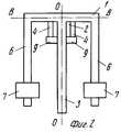 В резонаторе 1 механических колебаний могут возбуждаться как изгибные (фиг. 1), так и изгибно-крутильные (фиг. 4) колебания стержней 6. Стрелки c и d на фиг. 4 указывают направления изгибно-крутильных колебаний стержней 6. In the