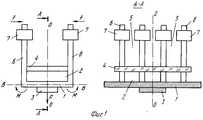На фиг. 4 показан вариант устройства для преобразования энергии колебаний, в резонаторе механических колебаний которого возбуждаются одновременно изгибные и крутильные колебания стержней. In FIG. 4 shows a variant of a device for converting vibrational energy, in the resonator of mechanical vibrations of which both bending and torsional vibrations of the rods are excited.