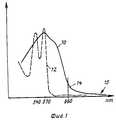 На фиг. 1 сплошной линией 10 показан спектр абсорбции в отношении соли тетразолия, 3-(4,5-диметилтиазолил-1-2)-2,5-дифенил бромида тетразолия (МТТ) и пунктирной линией 12 спектр абсорбции в отношении гемолизированной крови. Можно видеть, что диапазон длины волны составляет свыше 600 нм, когда МТТ может быть количественно определено с минимальной помехой от гемоглобина. Также можно видеть, что компенсация в отношении фоновой помехи может происходить при более высоких длинах волн. При измерениях абсорбции на двух длинах волн важно использовать длины волн, которые четко отделены друг от друга. Интерференционные фильтры, используемые для фильтра фотометра, определяются с точки зрения длины волны посредством длины волны, при которой достигается максимальное пропускание света. Дополнительно интерференционный фильтр имеет полуширину полосы пропускания определяемую, когда имеет место 50%-ное пропускания света. In FIG. 1,