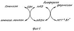 Диафораза также может быть получена из различных веществ, однако ее можно заменить другими известными веществами, например феназинметосульфат, мелдоловый голубой и т.п. Известны также и другие аналоги НАД (никотинамидный динуклеотид), наиболее известным из числа которых является НАДФ, который может быть восстановлен посредством реакции глюкозы (дегидрогеназы глюкозы и может передать восстановление красителю или цветной системе. Diaphorase can also be obtained from various substances, however, it can be replaced by other known substances, for example phenazine methosulfate, meldol blue, etc. Other analogs of NAD (nicotinamide dinucleotide) are also known, the most famous of which is NADP, which can be reduced by a glucose reaction (glucose dehydrogenase and can transfer the reduction to a dye or color system.