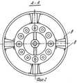 Для повышения эффективности ускоряющего резонатора необходимо обеспечить одинаковые амплитуды ускоряющего поля во всех зазорах, поскольку величины зазоров возрастают по мере ускорения ионов, а разность потенциалов между трубками дрейфа спадает на краях резонатора. Как показано на фиг.1, на каждом торцевом фланце резонатора выполнен кольцевой выступ 6 с полутрубками 7, на внешней цилиндрической поверхности которого установлены с возможностью азимутального перемещения четыре взаимно перпендикулярных штыря 8, которые не имеют электрического контакта с внутренней поверхностью экрана, а на каждом из колец с трубками дрейфа установлены подвижные контактные устройства 9, соединяющие внешнюю поверхность кольца и внутреннюю поверхность экрана. Штыри 8 используются для выравнивания поля в первых и последних зазорах резонатора. Регулируя их длину и ориентацию относительно опор, можно полностью компенсировать спад поля на краях, что проверено экспериментально на макете. Для компенсации спада поля в резонаторе с увеличивающимися по длине зазорами используются подвижные контактные устройства 9, позволяющие регулировать собственные частоты отдельных ячеек резонатора. Работоспособность их также подтверждена экспериментально. To increase the efficiency of the accelerating resonator, it is necessary to ensure the same amplitudes of the accelerating field in all the gaps, since the gaps increase as the ions accelerate, and the potential difference between the drift tubes decreases at the edges of the resonator. As shown in figure 1, on each end of the resonator flange is made an