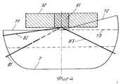 На проезжей части, содержащей осевую линию 81, левую обочину 82 и правую обочину 83, рисунок 4 показывает луч света 7, имеющий горизонтальную левостороннюю часть 71 границы света и темноты и правостороннюю часть 72, ломающуюся у этой границы при прохождении света, а также горизонтальную часть 73 с противотуманным светом. Лучи 15, 16, идущие от края отражателя 1, направляются отражательным сегментом 5 и объективом 4 в верхнюю половину пространства, где они образуют луч света 91. Полосные линзы 62 рефрактора 6 развивают упомянутый луч 91 в луч 92. Путем изменения бокового размера упомянутого луча 92 можно отрегулировать интенсивность освещения от оптимального значения как с точки зрения освещения, так и ослепления. On a roadway containing an