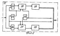 Сущность предлагаемого устройства видна также из примера конкретного его выполнения, представленного на фиг. 1. Как видно из фиг. 1, предлагаемое устройство содержит некоторое число каналов выделения измерительной информации 1,2, на входе которых включены преобразователи сигналов акустической эмиссии 3,4 и каждый из которых состоит из последовательно соединенных предварительного усилителя 5, регулируемого полосового фильтра 6, усилителя с автоматической регулировкой усиления 7 с узлом автоматической регулировки усиления 8, а также блока распознавания сигналов 9, причем блок распознавания сигналов содержит параллельно включенные усилитель-ограничитель 10 и амплитудный детектор 11, нагруженные соответственно на преобразователь "частота-код" 12 и аналого-цифровой преобразователь 13, управляемые от программируемого вычислителя 14. Временная связь программируемого вычислителя с работой ДВС осуществляется с помощью синхрогенератора 15, который может быть синхронизирован с работой ДВС либо через датчик синхронизации 16, либо от одного из каналов выделения измерительной информации с помощью блока формирования импульса 17, подключенного к синхрогенератору через коммутатор 18. Программируемый вычислитель считывает информацию с выходов преобразователей "частота-код" и аналого-цифровых преобразователей всех каналов выделения измерительной информации, обрабатывает ее по заданной программе с учетом установленного узлом 8 коэффициента усиления усилителя с автоматической регулировкой усиления 7 и выдает результаты обработки на блок команд 19, нагруженный на исполнительные механизмы ДВС. Необходимая оператору информация выводится на индикатор 20, а также в зависимости от заданной программы автоматически регистрируется регистрирующим устройством 21. The essence of the proposed device is also visible from the example of its specific implementation, shown in FIG. 1. As can be seen from FIG. 1, the proposed device contains a number of channels for extracting measurement information 1.2, the input of which includes acoustic emission signal converters 3.4 and each of which consists of a series-connected pre-amplifier 5, an adjustable band-pass filter 6, an amplifier with automatic gain control 7 s the automatic gain control unit 8, as well as the signal recognition unit 9, the signal recognition unit comprising parallel-connected amplifier-limiter 10 and amplitudes detector 11, respectively loaded on a frequency-to-