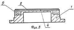 Затем одновременно формируют тензосхему на диэлектрике мембраны и втулки, что обеспечивает надежный электрический контакт элементов тензосхемы, находящихся на диэлектрике мембраны и диэлектрике, расположенном на торце втулки (фиг. 3). Выполняют часть контактов, которые будут располагаться между колодкой и упругим элементов, длиной, превышающий необходимую, формирование контактов может проводится до установки их в колодки. При этом полосы получают, как правило, прокаткой необходимой части цилиндрических контактов. Располагают контакты колодки по краям втулок (фиг. 4). Надвигают колодку на упругий элемент, при этом в силу того, что контакты выполнены из упругого материала, части контактов, выполненные в виде полос, будут деформироваться по мере надвигания колодки. Закрепляют колодку на упругом элементе, например, при помощи сварки. Закрепляют контакты колодки к контактным площадкам тензосхемы при помощи лазерной сварки через окна в колодке. При этом вместе с потоком энергии происходит перенос вещества контактов в контактные площадки, диэлектрик и частично цилиндрическую втулку. Вследствие этого прочность присоединения контактов к контактным площадкам существенно повышается. Кроме того, также за счет массопереноса вещества контактов в цилиндрическую втулку увеличивается адгезия контактных площадок и диэлектрика втулки. Применение цилиндрической втулки, толщина которой существенно больше толщины диэлектрической пленки, позволяет устранить замыкание контактных площадок на упругий элемент. Приварка контактов к контактным площадкам облегчается тем, что отсутствует необходимость дополнительного поддержания контактов, т.к. он плотно прилегает к контактным площадкам за счет собственных сил упругости. Then simultaneously form a strain diagram on the dielectric of the membrane and the sleeve, which provides reliable electrical contact of the strain gauge elements located on the dielectric of the membrane and the dielectric located at the end of the sleeve (Fig. 3). A part of the contacts is made, which will be located between the block and the elastic elements, with a length exceeding the necessary, the formation of contacts can be carried out before installing them in the pads. When this strip is obtained, as a rule, by rolling the necessary part of the cylindrical contacts. Pads are located on the edges of the bushings (Fig. 4). The shoe is pushed onto the elastic element, due to the fact that the contacts are made of elastic material, the parts of the contacts made in the form of strips will deform as the shoe is pushed. Fix the block on the elastic element, for example, by welding. They fix the contacts of the pads to the contact pads of the tensogram circuit using laser welding through the windows in the block. In this case, along with the energy flow, the material of the contacts is transferred to the contact pads, the dielectric, and the partially cylindrical sleeve. As a result, the strength of the attachment of contacts to the contact pads is significantly increased. In addition, also due to the mass transfer of the contact material into the cylindrical sleeve, the adhesion of the contact pads and the dielectric of the sleeve increases. The use of a cylindrical sleeve, the thickness of which is significantly greater than the thickness of the dielectric film, allows you to eliminate the closure of the contact pads on the elastic element. The welding of contacts to the pads is facilitated by the fact that there is no need for additional contact maintenance, as it fits snugly to the pads due to its own elastic forces.