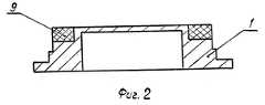 Изготавливают упругий элемент с припуском на последующую полировку. Непосредственно в кольцевой выемке упругого элемента формирует цилиндрическую втулку по известной технологии изготовления керамических деталей с припуском на полировку. Это сделано для того, чтобы между втулкой и упругим элементом не было зазора. Полируют поверхность мембраны одновременно с полировкой торца втулки, добиваясь тем самым расположения поверхности торца втулки в одной плоскости с поверхностью мембраны, как это изображено на фиг. 2. Методом тонкопленочной технологии одновременно наносят диэлектрическую пленку на мембрану упругого элемента и торец втулки, добиваясь тем самым одинаковой ее толщины как на мембране, так и на торце втулки. Все это приводит к тому, что элементы тензосхемы на мембране и торце втулки будут находиться в одной плоскости. An elastic element is made with an allowance for subsequent polishing. Directly in the annular recess of the elastic element forms a cylindrical sleeve according to the known technology for the manufacture of ceramic parts with an allowance for polishing. This is done so that there is no gap between the sleeve and the elastic element. The surface of the membrane is polished simultaneously with the polishing of the end face of the sleeve, thereby achieving the location of the surface of the end face of the sleeve in the same plane as the surface of the membrane, as shown in FIG. 2. By the method of thin-film technology, a dielectric film is simultaneously applied to the membrane of the elastic element and the end of the sleeve, thereby achieving its same thickness both on the membrane and on the end of the sleeve. All this leads to the fact that the elements of the strain diagram on the membrane and the end face of the sleeve will be in the same plane.