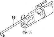 На фиг. 1 изображено устройство для осуществления лапароскопических вмешательств, общий вид; на фиг. 2 - отдельно зажим, общий вид; на фиг. 3 - фрагмент устройства с игольным держателем в рабочем положении; на фиг. 4 - фрагмент устройства с выдвинутым крючком. In FIG. 1 shows a device for laparoscopic interventions, general view; in FIG. 2 - separate clip, general view; in FIG. 3 - a fragment of the device with a needle holder in the working position; in FIG. 4 is a fragment of a device with an extended hook.