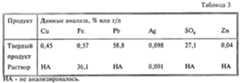 Флотационные хвосты фильтруют и промывают и часть влажного фильтра-осадка, 400 г твердого вещества, содержащего 0,2% Cu, 20,8% Fe, 28,6% Pb, 0,054% Ag и 2,2 % Zn, загружают в лабораторный автоклав, футерованный титаном, объемом 1 галлон (3,8 л) вместе с 2,2 л раствора, содержащего 5,5 г/л H2SO4 и 45 г/л SO2. Смесь нагревают до 150oC при перемешивании в течение 20 мин. Составы испытуемых продуктов приведены ниже в табл.3. Общая конверсия цинка возросла за счет восстановительного выщелачивания до 95%. Общая степень выделения свинца и серебра в остатке от восстановительного выщелачивания составляет 98 и 66% соответственно.Flotation tails are filtered and washed, and a portion of the wet filter cake, 400 g of a solid containing 0.2% Cu, 20.8% Fe, 28.6% Pb, 0.054% Ag and 2.2% Zn, are loaded into a laboratory autoclave lined with titanium with a volume of 1 gallon (3.8 L) together with 2.2 L of a solution containing 5.5 g / L H2 SO4 and 45 g / L SO2 . The mixture is heated to 150° C. with stirring for 20 minutes. The compositions of the tested products are shown below in table 3. The total conversion of zinc increased due to reductive leaching up to 95%. The total degree of release of lead and silver in the residue from reductive leaching is 98 and 66%, respectively.