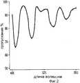 На фиг. 2 показано пропускание световой энергии как функция длины волны в обесцвеченном состоянии для окна 10, в котором стеклянная подложка 12 имеет показатель преломления 1,5, прозрачный оксидный слой 20 имеет показатель преломления 2,1 и толщину 450 нм, электрохромный электродный слой 30 имеет показатель преломления 2,1 и толщину 300 нм, ионопроводящий слой 40 имеет показатель преломления 1,5 и толщину 200 нм, противоэлектродный слой 50 имеет показатель преломления 2,0 и толщину 200 нм, прозрачный проводящий оксидный слой 22 имеет показатель преломления 2,1 и толщину 450 нм и стеклянный суперслой 14 имеет показатель преломления 1,5. Показано обесцвеченное состояние, потому что оно более чувствительно к проблемам достижения равномерного пропускания света как функции длины волны. Можно заметить, что пропускание света через данную слоистую структуру совсем не отличается равномерностью, в результате чего окно имеет цветную мозаику или радужный эффект. In FIG. 2 shows the transmission of light energy as a function of wavelength in a bleached state for a