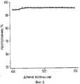 На фиг. 5 показано пропускание световой энергии как функции длины волны для окна 110 в обесцвеченном состоянии, в котором стеклянная подложка 12 имеет показатель преломления 1,5, слой оптической настройки 61 имеет показатель преломления 1,77 и толщину 75 нм, прозрачный проводящий оксидный слой 20 имеет показатель преломления 2,1 и толщину 450 нм, электрохроматический электродный слой 30 имеет показатель преломления 2,1 и толщину 300 нм, ионопроводящий слой 41 имеет показатель преломления 2,0 и толщину 200 нм, противоэлектродный слой 50 имеет показатель преломления 2,0 и толщину 200 нм, прозрачный проводящий оксидный слой 22 имеет показатель преломления 2,1 и толщину 450 нм, слой оптической настройки 62 имеет показатель преломления 1,77 и толщину 75 нм, слой слоистого пластика 70 имеет показатель преломления 1,5 и стеклянный суперслой 14 имеет показатель преломления 1,5. Как видно из фиг. 5, при перечисленных выше характеристиках получено окно 110, обладающее высокой равномерностью пропускания света. In FIG. 5 shows the transmission of light energy as a function of wavelength for