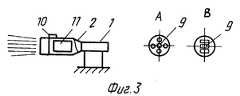 Предлагаемое изобретение поясняется графическим материалом. На фиг. 1 показана установка газодинамического тушения (УГДТ) с насадком закрытого типа; на фиг. 2 - с насадком открытого (эжекторного) типа; на фиг. 3 - с дожигателем, где 1 - реактивный авиационный двигатель типа ТРД, 2 - насадок, 3 - наконечник, 4 - патрубки подачи охлаждающих и пожаротушащих компонентов, 5 - газодинамический поток, 6 - реактивный авиационный двигатель типа ТВД (турбовинтовой двигатель), 7 - отверстие эжекторного типа, 8 - ствольные выходы (лафетные стволы), 9 - выходные отверстия наконечника, 10 - предохранительный клапан, 11 - дожигатель продуктов сгорания реактивного двигателя. The invention is illustrated in graphic material. In FIG. 1 shows the installation of gas-dynamic quenching (UGDT) with a nozzle closed type; in FIG. 2 - with nozzle open (ejector) type; in FIG. 3 - with an afterburner, where 1 is a turbojet jet engine, 2 is a nozzle, 3 is a nozzle, 4 is a nozzle for supplying cooling and fire extinguishing components, 5 is a gas-dynamic flow, 6 is a jet engine of the type TVD (turboprop engine), 7 - an ejector-type hole, 8 — barrel exits (fire monitors), 9 — tip outlet openings, 10 — safety valve, 11 — jet engine afterburner.
