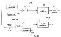 Изобретение также обеспечивает устройство для предварительной обработки набора коэффициентов преобразования для получения невосприимчивого к ошибкам набора коэффициентов преобразования для обработки посредством обратного ортогонального преобразования. Невосприимчивый к ошибкам набор коэффициентов преобразования свободен от ошибок округления, если он подвергается обратному ортогональному преобразованию. Устройство содержит накопитель. Накопитель получает каждый из коэффициентов преобразования в наборе и суммирует их. Схема оценки четности получает эту сумму от накопителя и оценивает четность суммы. Схема инвертирования четности работает тогда, когда схема оценки четности устанавливает, что контрольная сумма четная, и инвертирует четность одного из коэффициентов преобразования для получения коэффициента преобразования с инвертированной четностью. Коэффициент преобразования с инвертированной четностью делает контрольную сумму нечетной. В конце концов схема создает набор коэффициентов преобразования, включающий коэффициент преобразования с инвертированной четностью, в виде невосприимчивого к ошибкам набора. The invention also provides an apparatus for preprocessing a set of transform coefficients to obtain an error-immune set of transform coefficients for processing by inverse orthogonal transform. The error-resistant set of transform coefficients is free from rounding errors if it undergoes an inverse orthogonal transform. The device contains a drive. The drive receives each of the transform coefficients in the set and summarizes them. The parity estimation scheme receives this amount from the drive and evaluates the parity of the amount. The parity inversion circuitry works when the parity estimation circuitry determines that the checksum is even and inverts the parity of one of the transform coefficients to obtain a transform coefficient with inverted parity. An inverted parity transform coefficient makes the checksum odd. In the end, the circuit creates a set of transform coefficients, including an inverted parity transform coefficient, in the form of an error-immune set.