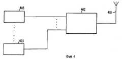 На фиг. 4 показаны несколько приемников 403, подключенных к одной антенне 401 через приемник - многоканальный разветвитель 402, который выполнен в виде широкополосного усилителя, принимающего широкополосный сигнал и имеющего множество узкополосных сигнальных выходов. В каждом из приемников 403 может быть реализовано настоящее изобретение в объеме, раскрытом выше со ссылкой на фиг. 3. Однако сам приемник-разветвитель 402 может оказаться в состоянии насыщения (запирания), обусловленном сильными сигналами, поступающими на его вход от антенны 401. В этом случае вполне очевидно, что любое ослабление в отдельных приемниках 403 не позволяет избежать такой перегрузки. Для устранения этой проблемы приемник-разветвитель 402 должен проектироваться на более высокий предел насыщения, чем каждый из приемников 403. In FIG. 4 shows