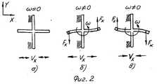 Вращение устройства вокруг оси Z с угловой скоростью ω(ω ≠ 0 на фиг. 2 б, в) вызывает появление Кориолисовой силы инерции Fk, воздействующей на элемент 1 перпендикулярно направлению линейного движения, Fk= 2mωVx, где m и Vk масса и линейная скорость элемента объема (см. Яворский Б.М., Детлаф А.А. Справочник по физике. М. , 1990, стр. 86). В этом случае к колебательному линейному движению элемента 1 добавляются изгибные колебания элемента 1 (см. фиг. 2).The rotation of the device around the Z axis with an angular velocity ω (ω ≠ 0 in Fig. 2 b, c) causes the appearance of the Coriolis force of inertia Fk acting on element 1 perpendicular to the direction of linear motion, Fk = 2mωVx , where m and Vk are masses and linear velocity of a volume element (see. Yavorsky BM, Detlaf AA. Handbook of Physics. M., 1990, p. 86). In this case, bending vibrations of the element 1 are added to the oscillatory linear motion of the element 1 (see Fig. 2).