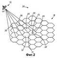 В целях лучшей иллюстрации допустим, что спутник 10 перемещается по направлению 30. Мобильные абоненты в пределах диаграммы направленности 18 имеют свои собственные запросы на связь через спутник 10. На фиг. 2 можно видеть, что каждая ячейка, например ячейка 20 ячеистой диаграммы направленности, будет иметь коническую форму или будет представлена конической ячейкой. Поскольку спутник 10 находится на орбите вокруг Земли, что каждая из ячеек диаграммы направленности 18 будет непрерывно перемещаться. Это явно находится в контрасте с наземными ячеистыми телефонными системами, в которых ячейки будут неподвижными, а мобильные абоненты перемещаются через ячейки. Передачи вызовов в наземных ячеистых системах основываются на обнаружении амплитуды передаваемых мобильным абонентом сигналов. For the sake of a better illustration, let us assume that