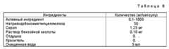Активный ингредиент просеивают через сито N 45 меш /США/, и смешивают с натрийкарбоксиметилцеллюлозой и сиропом, получают однородную пасту. Раствор бензойной кислоты, отдушку и краситель разбавляют некоторым количеством воды и добавляют в пасту при перемешивании. Затем добавляют воду в количестве, достаточном для получения требуемого объема. The active ingredient is sieved through a No. 45 mesh sieve / USA / and mixed with sodium carboxymethyl cellulose and syrup to form a homogeneous paste. The benzoic acid solution, perfume and color are diluted with some water and added to the paste with stirring. Then add water in an amount sufficient to obtain the desired volume.