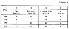 Пластмассовая смесь подвергалась деполимеризации в реакторе при температуре от 360oC до 420oC. При этом образовывались 4 фракции, количественное соотношение которых в зависимости от температуры в реакторе представлено в табл. 1.The plastic mixture was depolymerized in the reactor at a temperature of from 360o C to 420o C. In this case, 4 fractions were formed, the quantitative ratio of which, depending on the temperature in the reactor, is presented in table. 1.