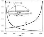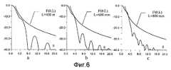 In (5), it is assumed that the reference i is from the center of the ruler. The values of αi in FIG. 6 are obtained for two cases of excitation of the line: from the center (schedule P1 ) and from the ends of the line (schedule P2 ). The layout of the two-part ruler allows you to approximately double the broadband PA. When washing from the center, the values of the coefficient αi change much less than for the case of feeding the ruler from the ends (αi = 0.02 - 1.0). FIG. 6 illustrates the directivity pattern of a PA line powered from the center for three line lengths of 400, 600, 800 mm and parameter values a2 = 16.0 mm, d = 10.0 mm, d2 = 14.5 mm, f2max = 145 GHz and the envelope εi in in accordance with (5). The envelope of the permissible level of the side lobes of the radiation pattern F (θ, L) = - G + 52-10lg L / λ - 25lg θ was determined for the values G = 37 dB, L = 400, 600, 800 mm, λ = 21 mm. From FIG. 6 it follows that the PA radiation pattern does not go beyond the F (θ, L) curve at L = 400 - 800 mm. The far side lobes are significantly lower than the curve F (θ, L) and the requirements for the decline of the side lobes are fulfilled. In FIG. 7 shows the frequency dependence of the surface utilization coefficient ПА η with rulers of the form of FIG. 2 with central washing (see FIG. 5) with a length L = 600 mm, λ2 = 21 mm for cases of distribution of the electric field intensity over the gaps εi = const and c εi in accordance with (5). The quantity η is determined from the relation