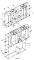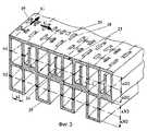 Слой ВВ 2 компонуется из прямоугольных волноводов сечением a3•b2 (см. фиг. 3), параллельных ИВ и расположенных под ними. На фиг. 8 показан участок перекрытия ВВ 10, в центре которого расположены продольные гантельные щели связи (ЩС) 22 канала λ1 и 21 канала λ2, возбуждающие в центральном сечении ПА соответственно П-образные и прямоугольные ИВ. Все возбуждающие прямоугольные волноводы 2 замкнуты с одного конца в сечении, которое смещено от центра гантельных поперечных и продольных возбуждающих щелей по оси этих волноводов: в одну сторону для возбуждающих волноводов с поперечной щелью 21 и в другую сторону для волноводов с продольной щелью 22, все незамкнутые выходы объединены E- сумматорами 8, 9, выходы которых смещены на расстояние, равное расстоянию между осями прямоугольного и П-образного излучающих волноводов. На фиг. 4 представлена схема каскада линейки ПА с последовательным включением резонансных щелей для случая работы в режиме бегущей волны. В схеме фиг. 4 использованы обозначения: W0, θ - волновое сопротивление и электрическая длина линии передачи между ИЩ; ri - активное сопротивление i-й ИЩ; Ni - коэффициент трансформации идеального трансформатора, обеспечивающий односторонне согласование ИЩ; Ui, Ii, U'i = Ui, Ni, I'i/Ni - напряжения и токи на входе и выходе идеального трансформатора; Pi, Pi+1 - мощность, подводимая к входу i-го и (i+1)-го каскадов линейки.In FIG. 1 shows the proposed construction option of a folding two-input PA, in which the disadvantages of the prototype are eliminated. PA with dimensions L x L x H consists of two antenna panels with dimensions L x L / 2 x H, articulated in the S plane (see Fig. 1a, b). The panels can rotate around an